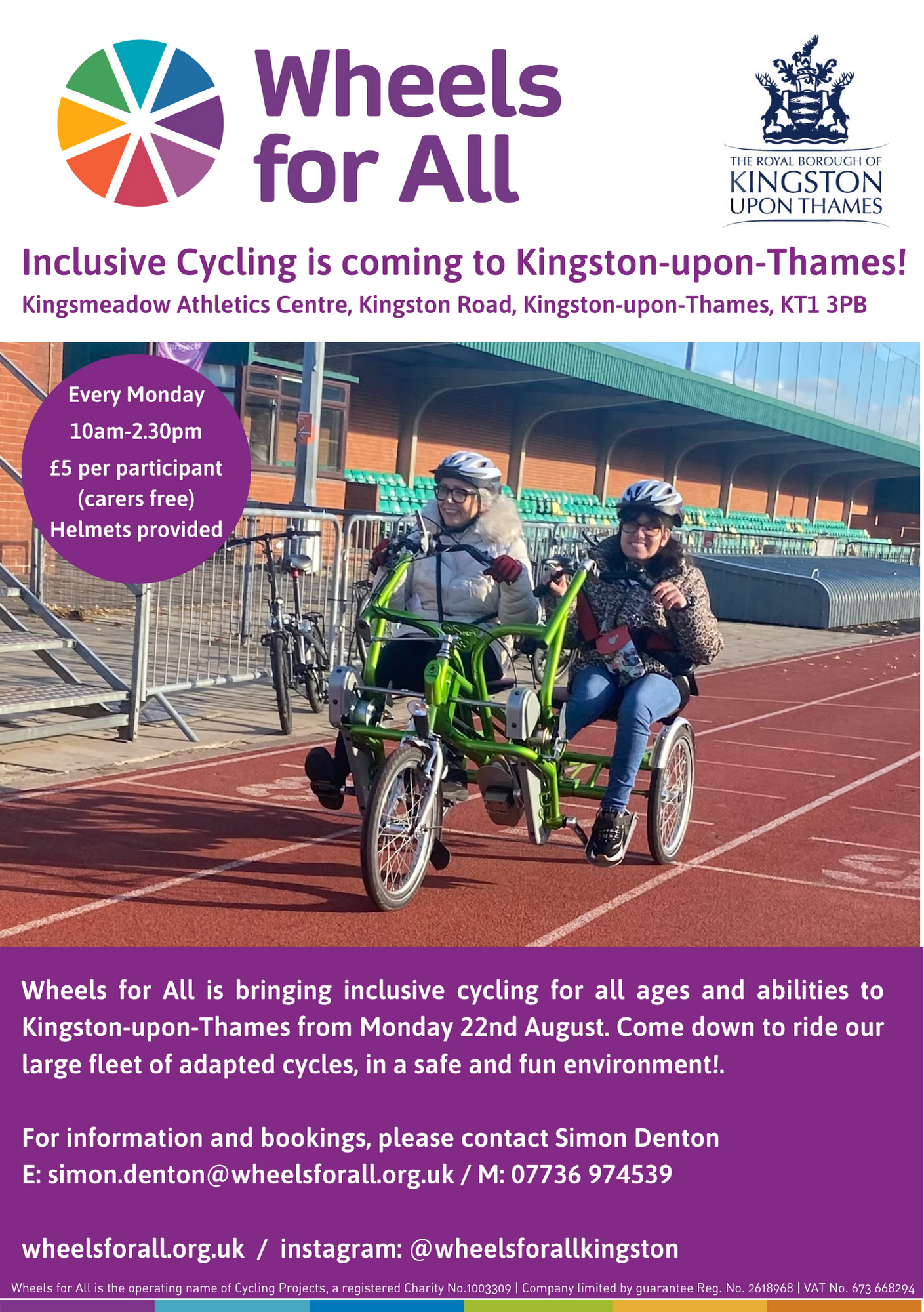 Wheels for All is bringing inclusive cycling for all ages and abilities to Kingston-upon-Thames from Monday 22nd August.