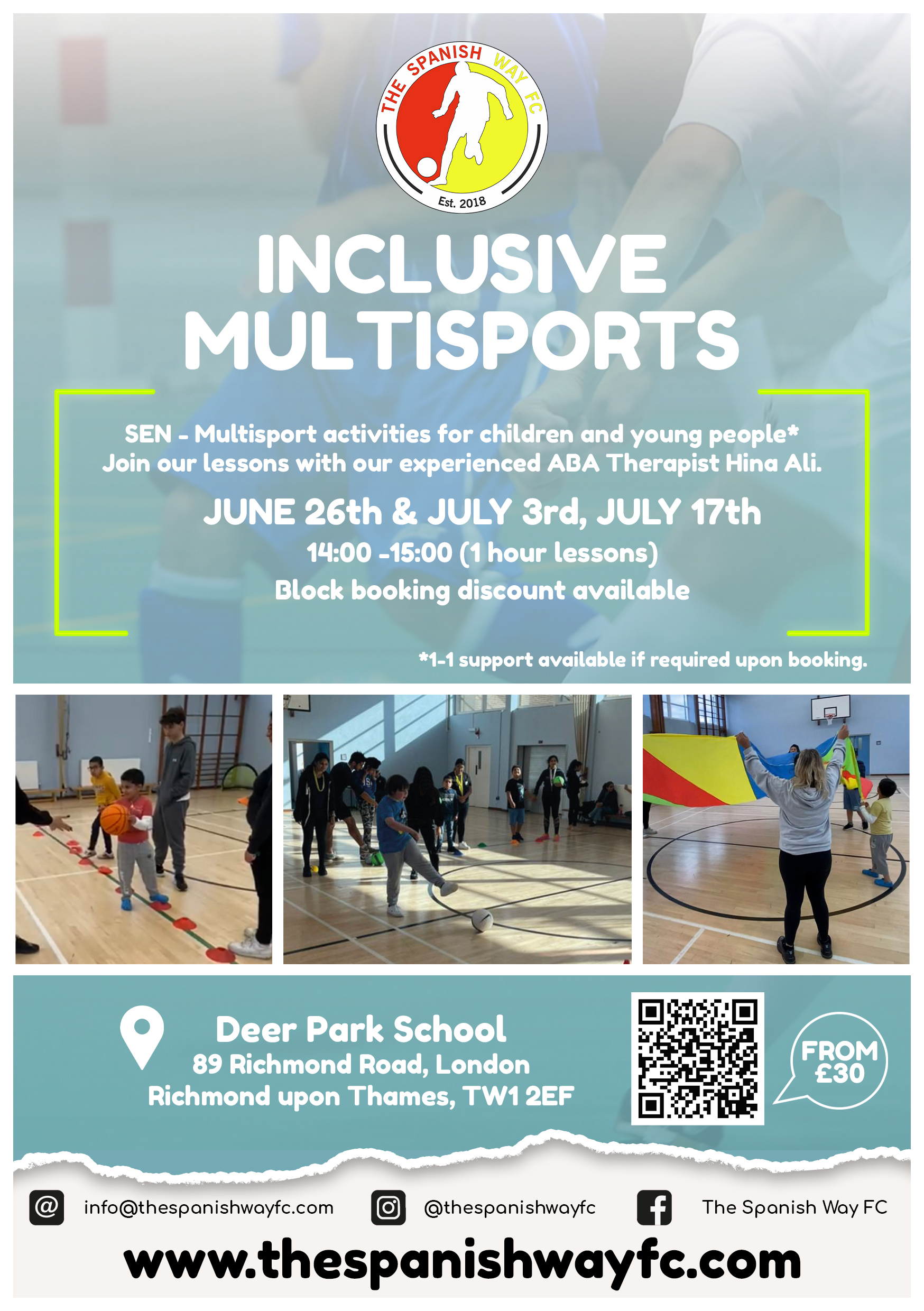 Inclusive Multisports is a sports club for children and young people with additional needs in Richmond. Our club provides different sports each Sunday, under the in-site supervision of our Head Therapist. Activities are provided by our Head Coach, and participants get help and support from 1:1 tutors.